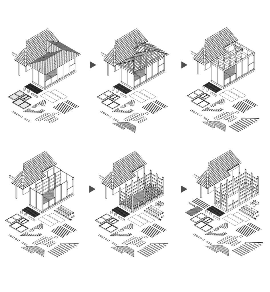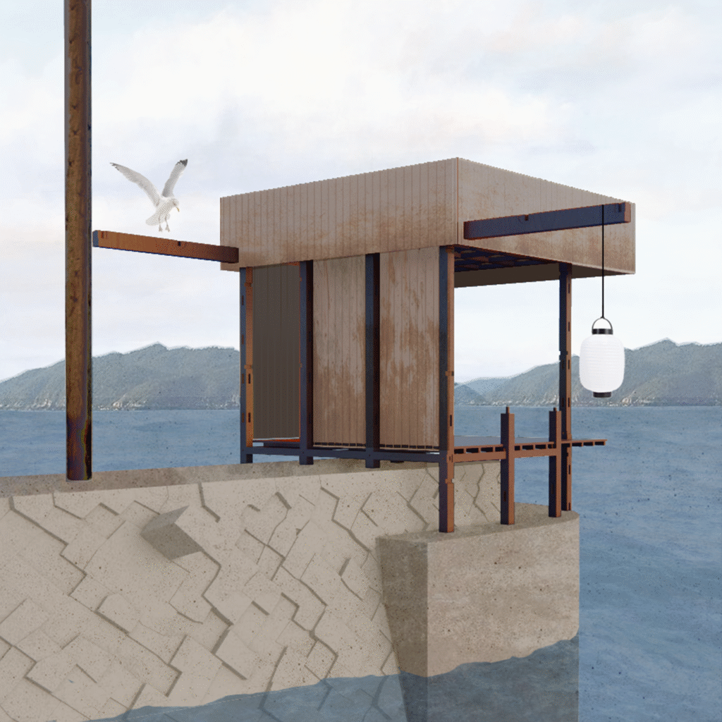 En inventering av ett befintligt hus blir till en instruktion på hur man kan se på begagnat material och dess potential. En ny design av en paviljong för havsfiske uppstår i samband med inventeringen.